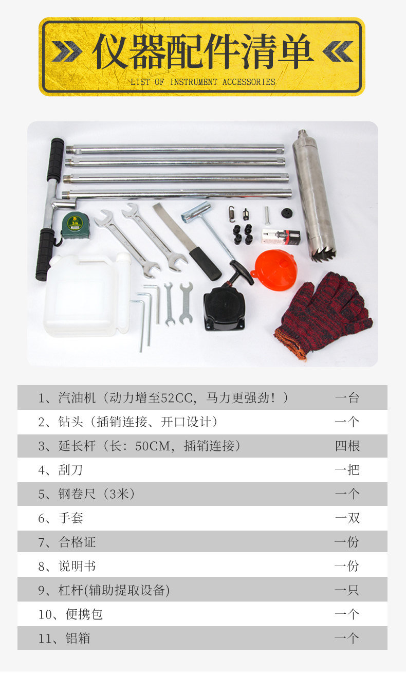 汽油動(dòng)力發(fā)動(dòng)機(jī)一臺(tái),發(fā)動(dòng)機(jī)工具包一套,標(biāo)準(zhǔn)土壤鉆頭、硬質(zhì)土鉆頭隨意選配,不小于1米的鉆桿5根、不小于1米的塑料樣品管2根,刮刀、老虎鉗、耳機(jī)、5M卷尺、手套、清潔刷各1個(gè),專(zhuān)用提取設(shè)備1套、工業(yè)塑料運(yùn)輸箱1個(gè)