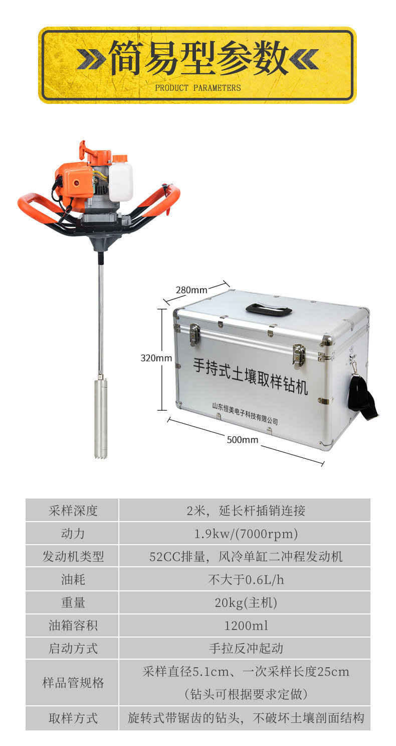 HM-QY800單人手持式土壤取樣鉆機(jī)是在參考大型液壓、汽油、氣動(dòng)鉆機(jī)的基礎(chǔ)上設(shè)計(jì)的一款輕便的土壤采集鉆機(jī)。即使沒(méi)有操作經(jīng)驗(yàn)的鉆探人員,簡(jiǎn)單培訓(xùn)就可操作。取樣過(guò)程及其簡(jiǎn)單,1到2個(gè)人即可完成設(shè)備的操作。整個(gè)鉆進(jìn)過(guò)程無(wú)需加水,保證了樣品取得的質(zhì)量(無(wú)污染、無(wú)擾動(dòng))。